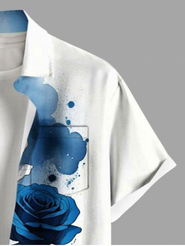 Plus Size Rose Flower Leaf Watercolor Print Buttons Pocket Shirt For Men - Blue - 2xl