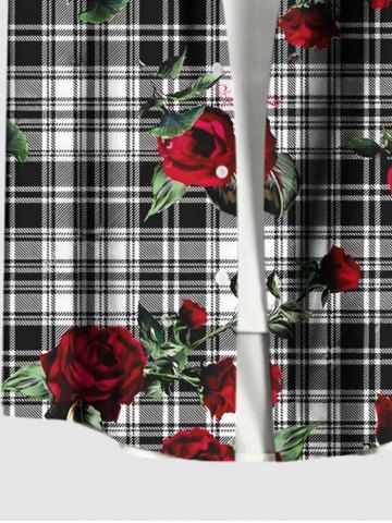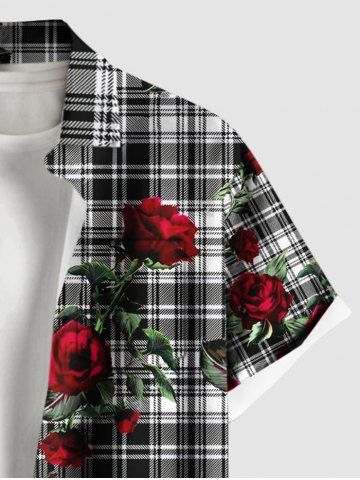 Plus Size Rose Flower Leave Plaid Print Hawaii Button Pocket Shirt For Men - Black - 6xl