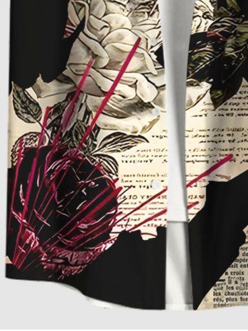 Plus Size Rose Flower Leaves Newspaper Print Buttons Pocket Shirt For Men - Black - S