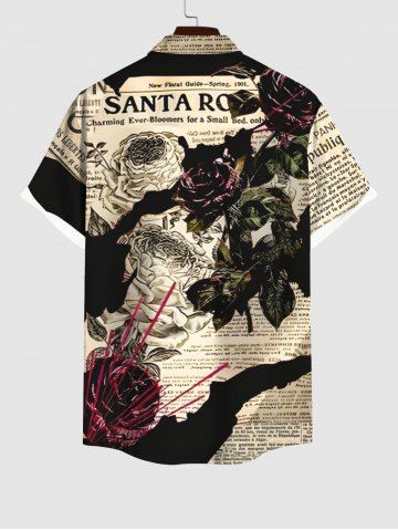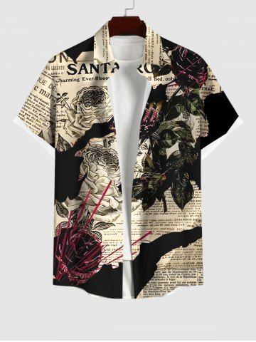 Short Sleeves Shirts > Plus Size Rose Flower Leaves Newspaper Print Buttons Pocket Shirt For Men