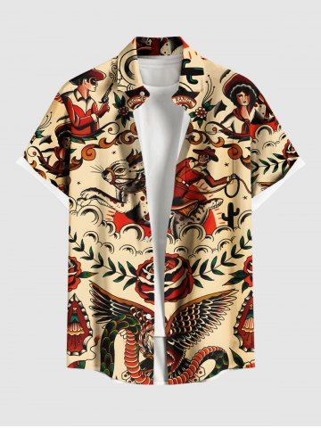Plus Size Rose Flower Rabbit Eagle Snake Print Buttons Pocket Shirt For Men - Apricot - 6xl