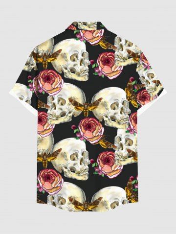 Plus Size Rose Flower Skull Butterfly Print Buttons Pocket Shirt For Men - Black - 2xl