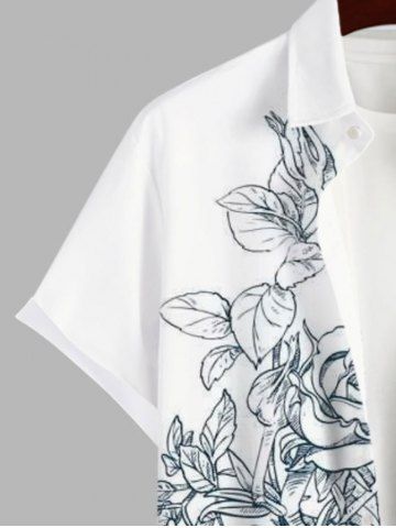 Plus Size Rose Flowers Leaf Colorblock Print Buttons Pocket Shirt For Men - White - L