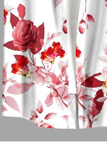 Plus Size Rose Flowers Leaf Print Buttons Pocket Hawaii Shirt For Men - Red - L