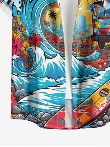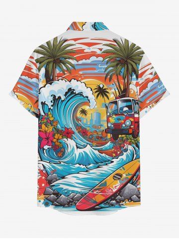 Short Sleeves Shirts > Plus Size Sea Waves Coconut Tree Flower Bus Sun Print Buttons Pocket Hawaii Shirt For Men