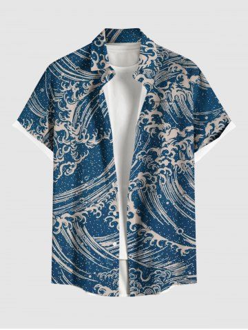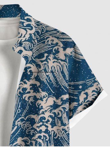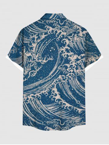 Plus Size Sea Waves Retro Pattern Print Buttons Pocket Hawaii Cruise Shirt For Men - Deep Blue - M