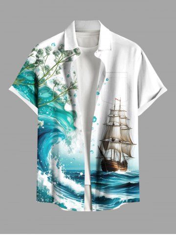 Plus Size Sea Waves Sailboat Flower Branch Print Hawaii Cruise Button Pocket Shirt For Men - White - 3xl