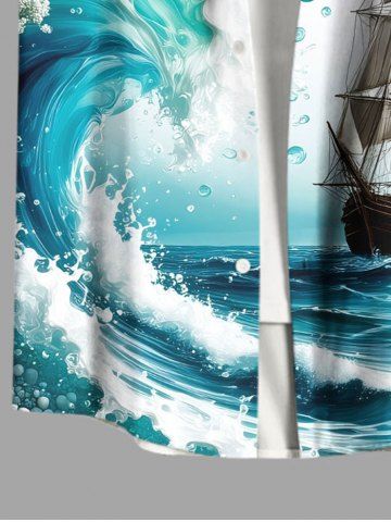Short Sleeves Shirts > Plus Size Sea Waves Sailboat Flower Branch Print Hawaii Cruise Button Pocket Shirt For Men