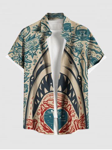 Plus Size Shark Heart Skulls Diver Print Buttons Pocket Hawaii Shirt For Men - Light Coffee - 3xl