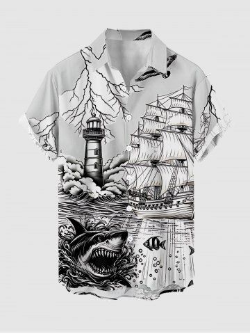 Plus Size Shark Sailboat Sea Waves Lighthouse Print Hawaii Cruise Button Pocket Shirt For Men - White - Xl
