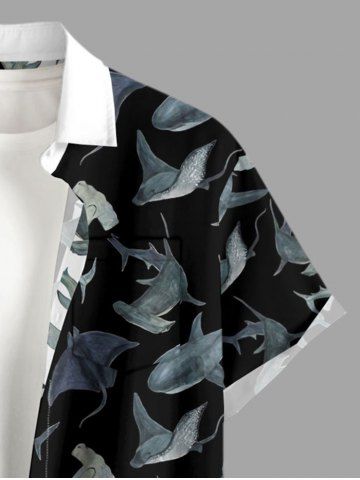 Plus Size Sharks Colorblock Print Buttons Pocket Hawaii Shirt For Men - Black - L