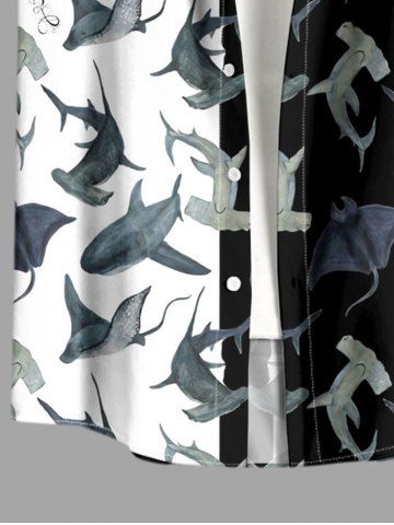 Plus Size Sharks Colorblock Print Buttons Pocket Hawaii Shirt For Men - Black - 6xl