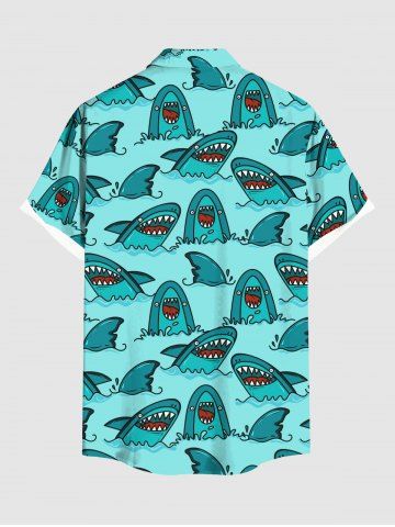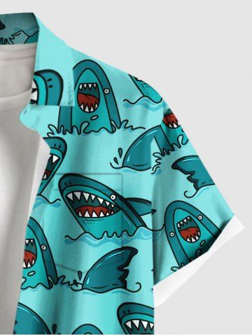 Plus Size Sharks Sea Waves Print Buttons Pocket Hawaii Shirt For Men - Mint Green - M