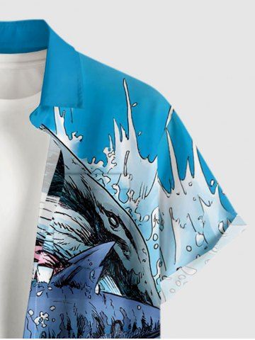 Plus Size Sharks Sea Waves Print Buttons Pocket Hawaii Shirt For Men - Light Blue - 5xl