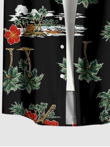 Plus Size Skull Coconut Tree Flowers Print Buttons Pocket Hawaii Shirt For Men - Black - L