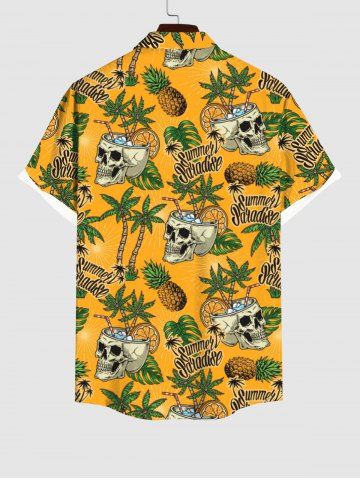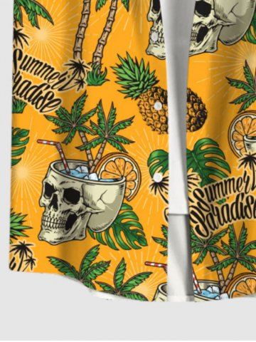 Plus Size Skull Coconut Tree Pineapple Letters Print Hawaii Button Pocket Shirt For Men - Orange - M
