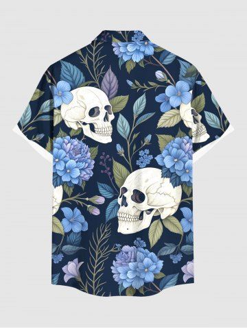 Plus Size Skull Flower Leaf Branch Print Hawaii Button Pocket Shirt For Men - Blue - M
