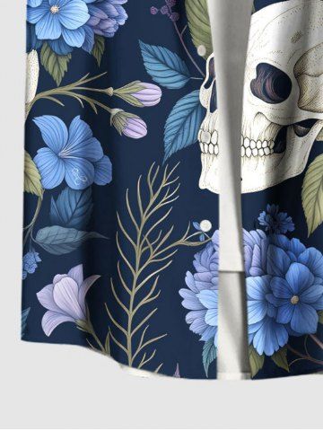 Plus Size Skull Flower Leaf Branch Print Hawaii Button Pocket Shirt For Men - Blue - 6xl