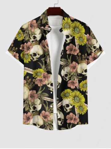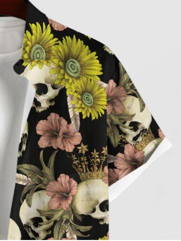Short Sleeves Shirts > Plus Size Skull Flower Print Hawaii Button Pocket Shirt For Men