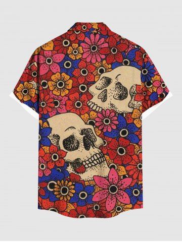 Plus Size Skull Flower Print Hawaii Button Pocket Shirt For Men - Red - 5xl
