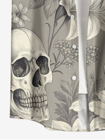 Plus Size Skull Flowers Leaf Print Buttons Pocket Hawaii Shirt For Men - Light Gray - L