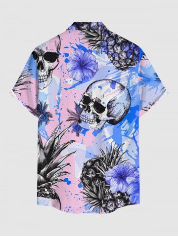 Plus Size Skull Hibiscus Flower Pineapple Paint Splatter Print Buttons Pocket Hawaii Shirt For Men - Pink - S