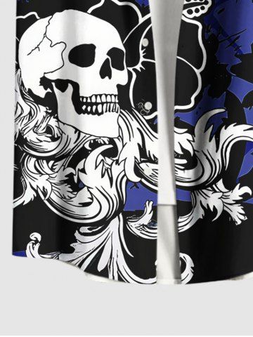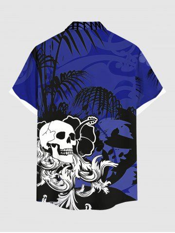 Plus Size Skull Hibiscus Flowers Tropical Leaf Print Buttons Pocket Hawaii Shirt For Men - Blue - 6xl