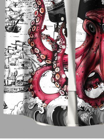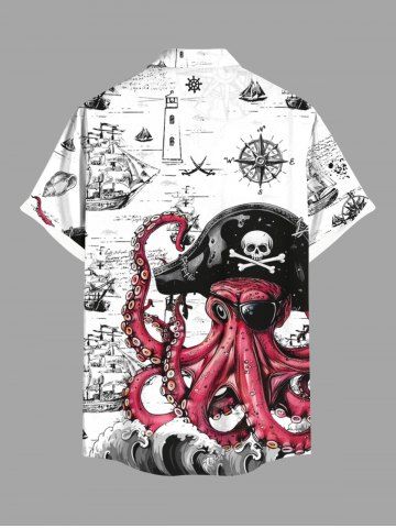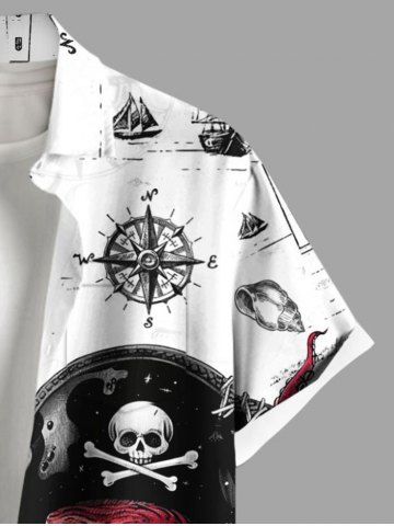 Plus Size Skull Octopus Pirate Sailboat Print Hawaii Cruise Buttons Pocket Shirt For Men - White - L