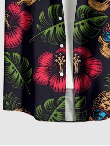 Plus Size Skull Pineapple Hibiscus Flower Tropical Leaf Print Buttons Pocket Hawaii Shirt For Men - Black - 5xl