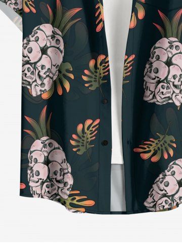 Plus Size Skull Pineapple Tropical Leaf Print Buttons Pocket Hawaii Shirt For Men - Deep Green - L