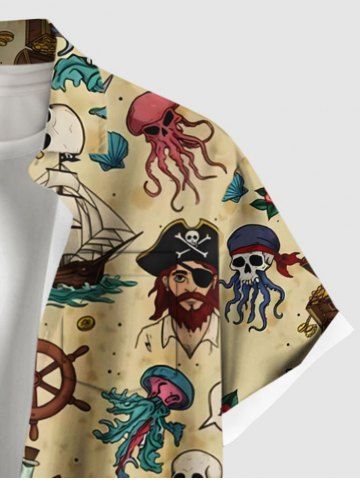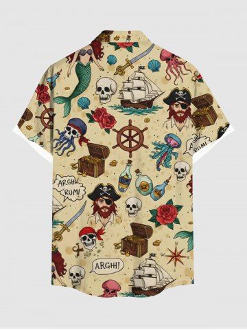Plus Size Skull Pirate Rose Flower Ship Rudder Mermaid Cruise Print Buttons Pocket Hawaii Shirt For Men - Beige - L
