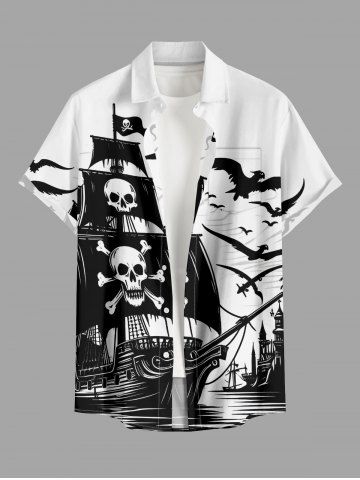 Plus Size Skull Pirate Sailboat Bird Print Hawaii Cruise Button Pocket Shirt For Men - White - L
