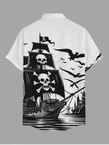 Plus Size Skull Pirate Sailboat Bird Print Hawaii Cruise Button Pocket Shirt For Men - White - 6xl
