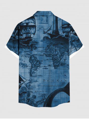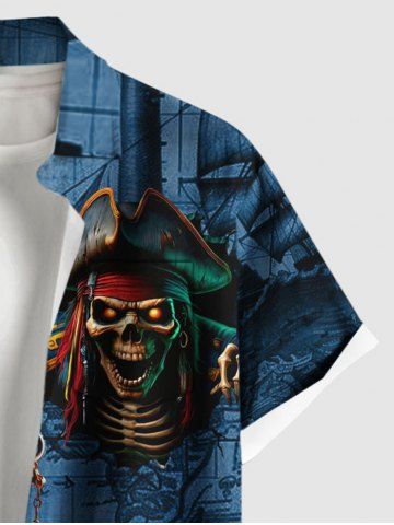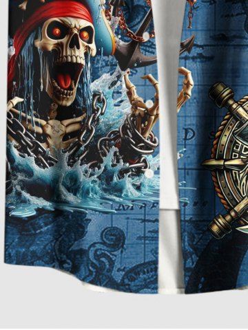 Plus Size Skull Pirate Sea Waves Sailboat Print Hawaii Cruise Ombre Button Pocket Shirt For Men - Deep Blue - Xl