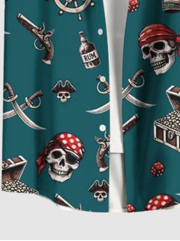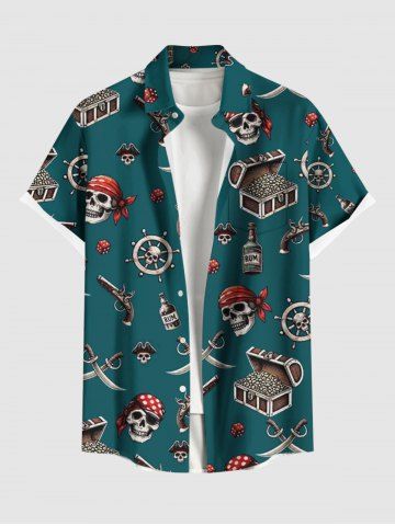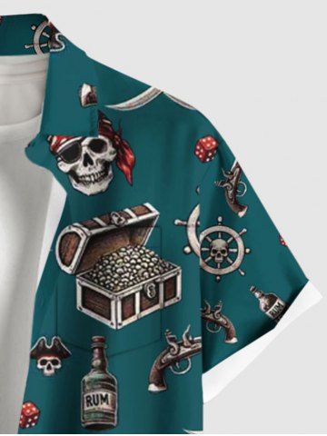 Plus Size Skull Pirate Ship Rudder Gun Knif Cruise Print Buttons Pocket Hawaii Shirt For Men - Deep Green - 4xl