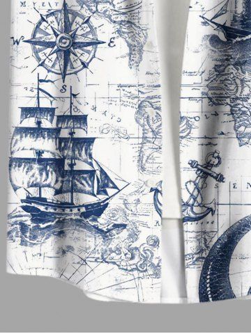 Plus Size Skull Pirate Ship Rudder Map Cruise Print Buttons Pocket Hawaii Shirt For Men - Blue - 3xl