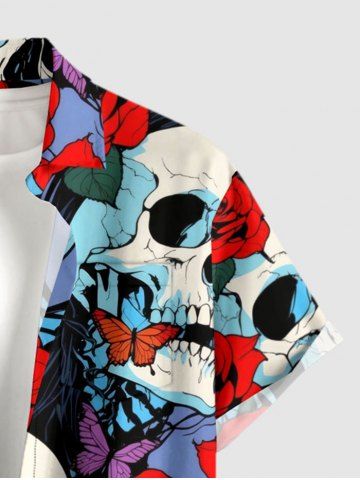 Plus Size Skull Rose Flower Butterfly Print Button Pocket Shirt For Men - Red - 3xl