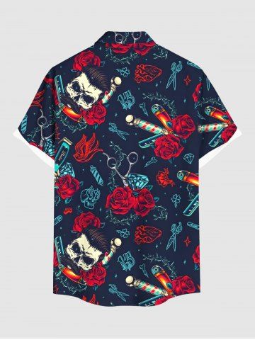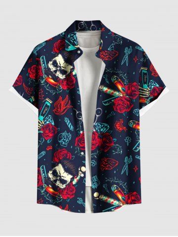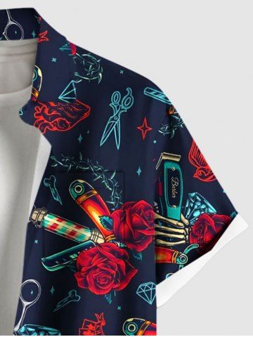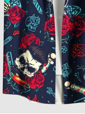 Plus Size Skull Rose Flower Heart Diamond Print Button Pocket Shirt For Men - Deep Blue - 6xl