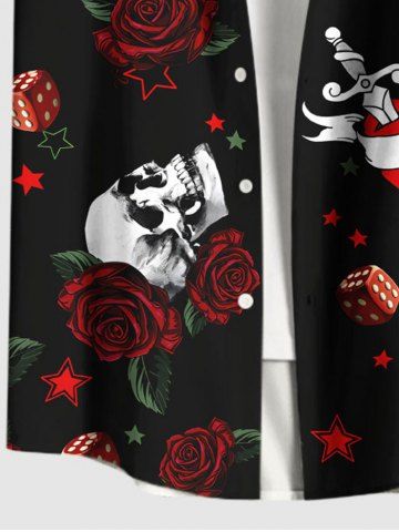 Plus Size Skull Rose Flower Heart Sword Print Halloween Button Pocket Shirt For Men - Black - L