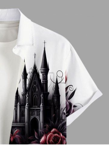 Short Sleeves Shirts > Plus Size Skull Rose Flower Ink Painting Castle Letter Print Button Pocket Shirt For Men