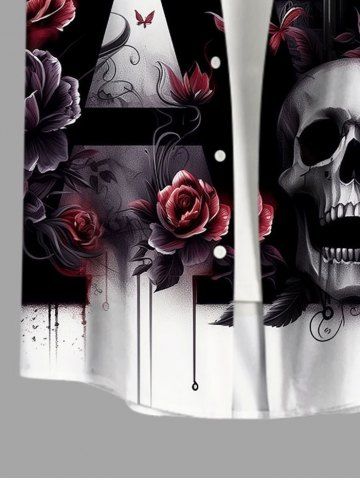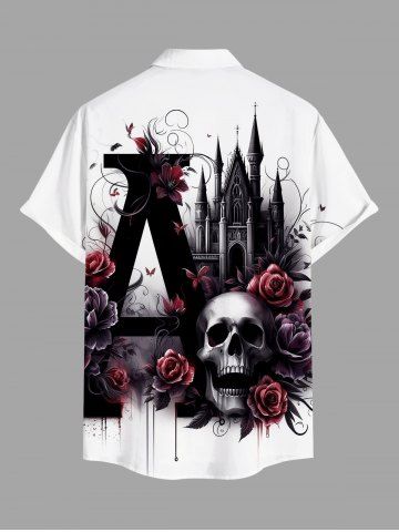 Plus Size Skull Rose Flower Ink Painting Castle Letter Print Button Pocket Shirt For Men - White - L