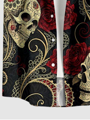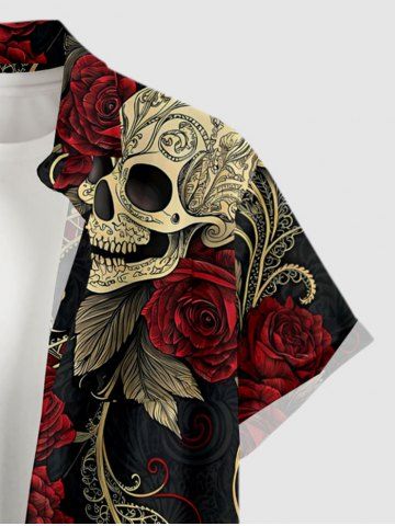 Plus Size Skull Rose Flower Leaf Print Button Pocket Shirt For Men - Deep Red - 6xl