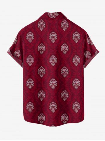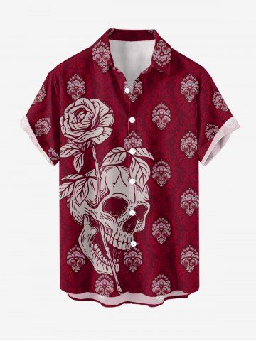 Plus Size Skull Rose Flower Leaf Print Hawaii Button Pocket Shirt For Men - Red Wine - S