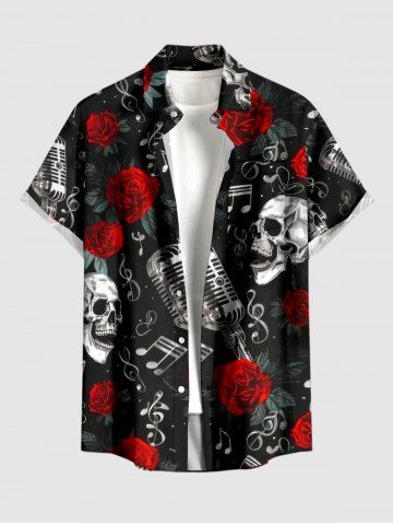 Short Sleeves Shirts > Plus Size Skull Rose Flower Microphone Music Symbol Print Button Pocket Shirt For Men