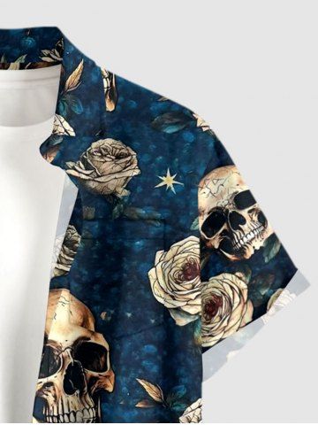 Plus Size Skull Rose Flower Print Buttons Pocket Hawaii Shirt For Men - Cadetblue - 4xl