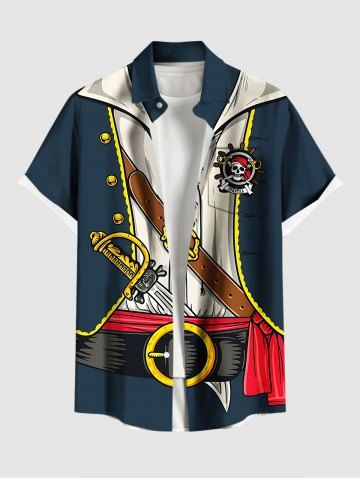 Plus Size Skull Ship Rudder Knife Pirate Costume Print Buttons Pocket Hawaii Shirt For Men - Midnight Blue - 6xl