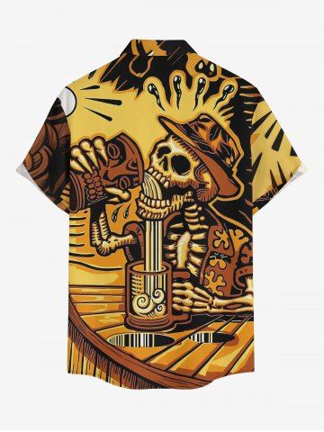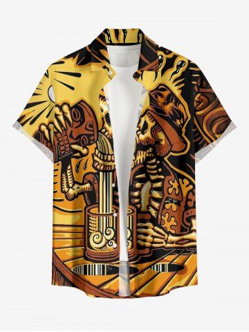 Plus Size Skull Skeleton Beer Ethnic Print Buttons Pocket Hawaii Shirt For Men - Yellow - S