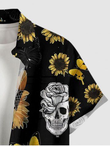 Plus Size Skull Sunflower Butterfly Print Buttons Pocket Hawaii Shirt For Men - Black - M
