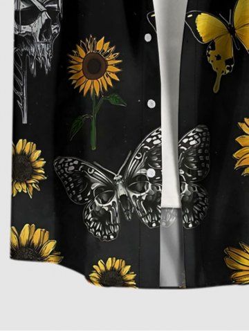 Plus Size Skull Sunflower Butterfly Print Buttons Pocket Hawaii Shirt For Men - Black - 4xl