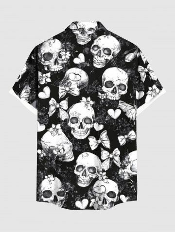 Plus Size Skulls Bowknot Heart Flowers Print Buttons Pocket Shirt For Men - Black - S